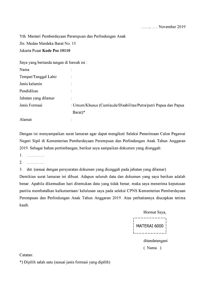 Format surat pernyataan dan lamaran cpns kementerian hukum dan hak asasi manusia ta 2018.